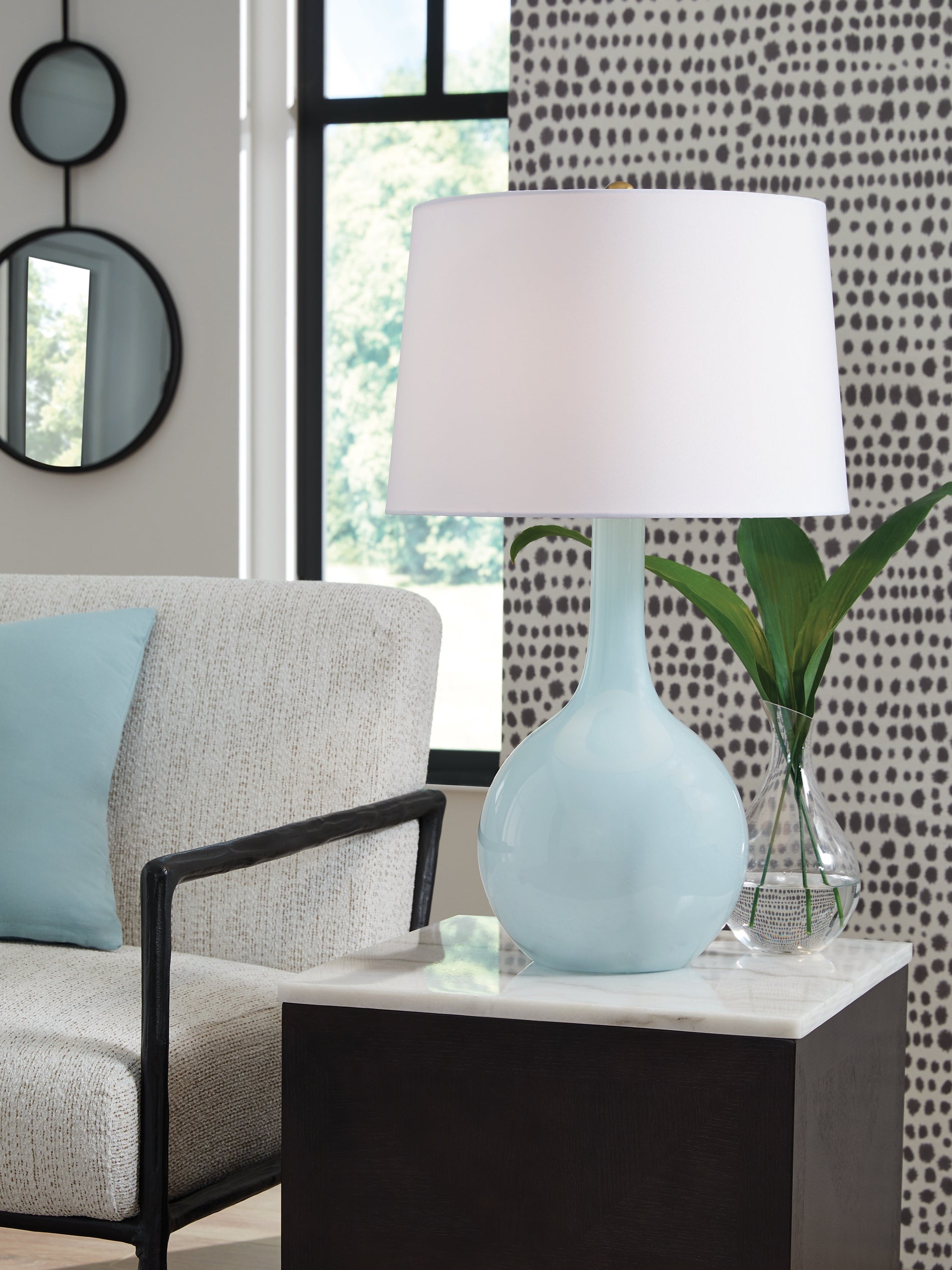 | Details | Made of glass with modified drum hardback fabric shade, Aqua finish, 3-way switch, 1 E26 socket, type A bulb recommended (not included); 150 watts max or LED equivalent; UL Listed, Due to the finishing process of this product, some variations may occur, Assembly required | |