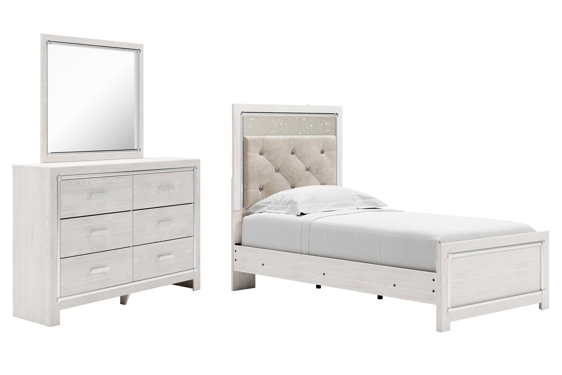 | Details | B2640B6: Twin panel bed (headboard, footboard and rails), Made of engineered wood (MDF/particleboard) and decorative laminate, Light finish with subtle pearl effect over replicated cedar grain with authentic touch, Headboard with gray polyester upholstery with faux crystal button tufting, Headboard with glitter panel accent, Faceted chrome-tone accents, Headboard with LED light strip with remote-controlled color and brightness options, Power cord included; UL Listed, Foundation/box spring required, sold separately, Mattress available, sold separately, Assembly required, Bed is compatible with an adjustable base, B2640B1: Made of engineered wood (MDF/particleboard) and decorative laminate, Light finish with subtle pearl effect over replicated cedar grain with authentic touch, Large scale chrome-tone handles with mosaic details, Faceted chrome-tone accents, Six smooth-gliding drawers with faux linen lining, Mirror attaches to back of dresser, Safety is a top priority, clothing storage units are designed to meet the most current standard for stability, ASTM F 2057 (ASTM International), Drawers extend out to accommodate maximum access to drawer interior while maintaining safety, Assembly required, | |